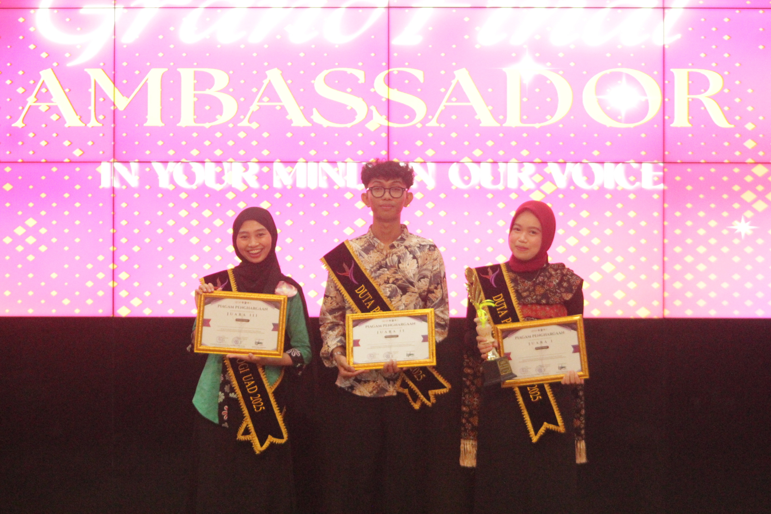 Setelah melalui proses penilaian yang ketat dan objektif, dewan juri menetapkan para pemenang Duta Psikologi UAD 2025. Gelar juara pertama diraih oleh Mutiah Miftahul Jannah (Psikologi UAD Angkatan 2024). Posisi juara kedua diraih oleh Farhan Firdaus (Psikologi UAD Angkatan 2024), disusul Farida Nailatul Izzah (Psikologi UAD Angkatan 2024) sebagai juara ketiga. Pengumuman pemenang disertai sesi penyematan selempang dan menjadi momen puncak yang disambut meriah oleh seluruh hadirin