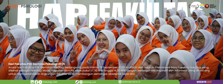 Yogyakarta, 18 September 2025 – Rangkaian kegiatan Pengenalan Kehidupan Kampus bagi Mahasiswa Baru (P2K) Universitas Ahmad Dahlan (UAD) tahun 2025 terus berlanjut dengan penuh antusiasme. Salah satu acara penting dalam rangkaian tersebut adalah “Hari Fakultas”, yang diselenggarakan oleh Fakultas Psikologi UAD di Kampus 1, Jalan Kapas No. 9, Semaki, Umbulharjo, Yogyakarta.