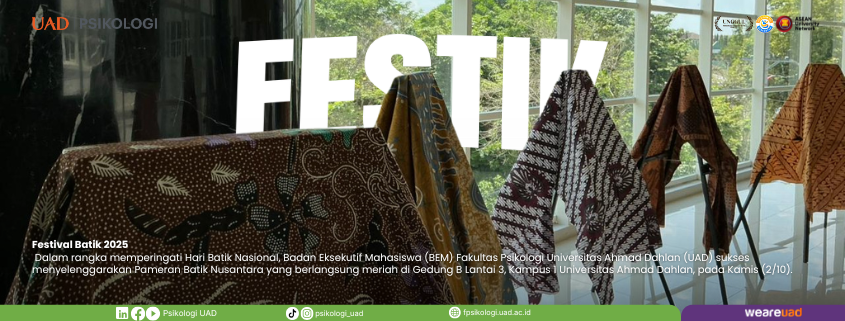Yogyakarta, 2 Oktober 2025 — Dalam rangka memperingati Hari Batik Nasional, Badan Eksekutif Mahasiswa (BEM) Fakultas Psikologi Universitas Ahmad Dahlan (UAD) sukses menyelenggarakan Pameran Batik Nusantara yang berlangsung meriah di Gedung B Lantai 3, Kampus 1 Universitas Ahmad Dahlan, pada Kamis (2/10).